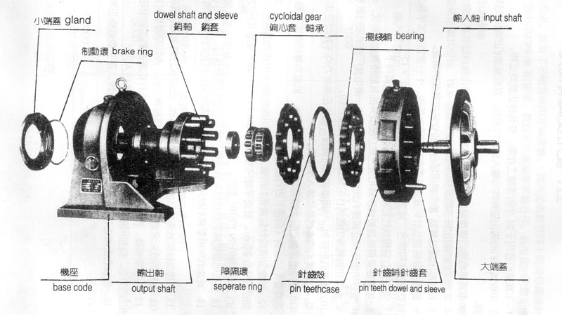一級XLD立式擺線針輪減速機全部傳動裝置結構可分為三部分:輸入部分、減速部分、輸出部分,其輸入結構是高速部分,連接輸入電動機(馬達);其輸出部分是減速機的低速部分,其輸出軸通過鏈輪或者聯軸器、連接盤等接入用戶需要帶動的設備。