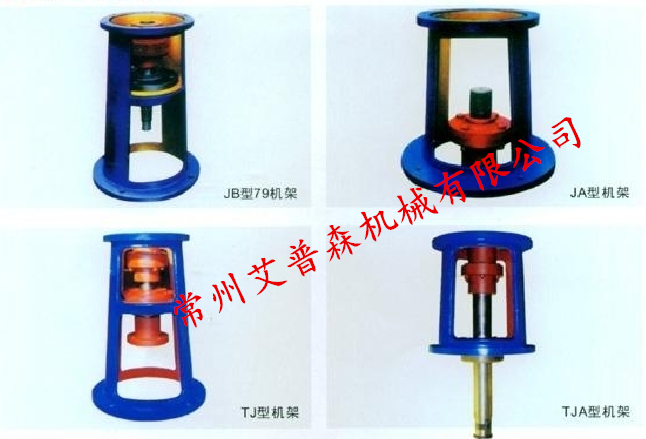 3、單支點機架 符合下列條件之一者,選用單支點機架為最佳。 a)攪拌容器設置底軸承,作為一個受力支點; b)軸封本體設有軸承(包括剛性襯套),作為一個受力支點(受力程度按軸封要求規定); c)攪拌容器內,軸中部設有導向軸承,作為一受力支點(即中間軸承)。 當具備上述條件的攪拌軸,在選用單支點機架時,攪拌軸與減速機之間的聯軸器須選用TK型彈性塊聯軸器。 減速機機架