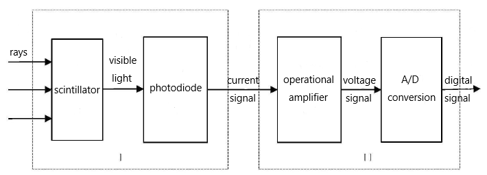 從探測(cè)器結(jié)構(gòu)圖(圖2)可以清楚地看到工業(yè)CT探測(cè)器的信號(hào)轉(zhuǎn)換過程。首先,射線信號(hào)進(jìn)入閃爍體,在閃爍體中產(chǎn)生可見光。光電二極管將可見光轉(zhuǎn)換為電流信號(hào)。然后,i-v轉(zhuǎn)換電路將電流信號(hào)轉(zhuǎn)換成電壓信號(hào)。最后,由AD轉(zhuǎn)換裝置將其轉(zhuǎn)換為數(shù)字信號(hào),并傳輸至數(shù)據(jù)傳輸系統(tǒng)。