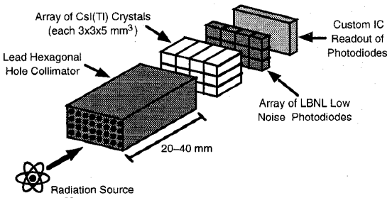 圖解說明了離散閃爍相機(jī)的模塊。該原型具有一個(gè)3×4像素陣列,每個(gè)像素由一個(gè)3×3?5 mm3 CsI(TI)晶體與一個(gè)3×3 mm2 PIN光電二極管耦合組成。讀出電路由兩個(gè)3×3 mm2的IC組成。可以從單個(gè)模塊的陣列中構(gòu)造出具有有用成像尺寸的相機(jī)。
