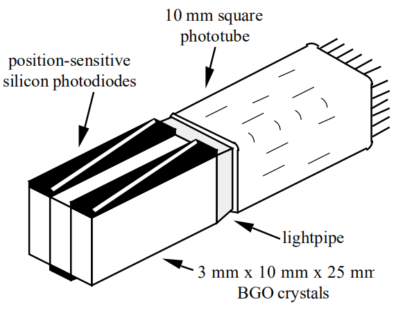 圖示了一種由三個(gè)或三個(gè)以上的光學(xué)隔離BGO晶體組成的探測(cè)器,該晶體連接在一個(gè)10 mm的方形光電倍增管上,該光電倍增管為該組提供一個(gè)快速定時(shí)脈沖。每個(gè)晶體還單獨(dú)耦合到位置敏感光電二極管,該光電二極管識(shí)別阻止湮滅光子的晶體并確定相互作用的深度。